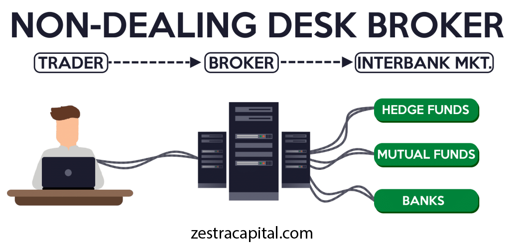 No dealing desks represent a departure from the traditional model, aiming to eliminate intermediaries between traders and the interbank market. Brokers adopting the no dealing desk model, such as straight-through processing (STP) or electronic communication network (ECN) brokers, connect traders directly to liquidity providers.